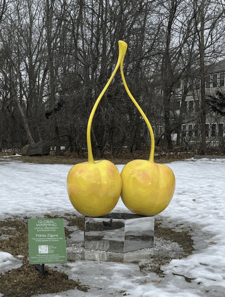 The sculpture Global Warming, a pair of yellow cherries with a map of the world etched into them, was made and leased to Burlington by a Ukrainian artist but could not be returned once the war broke out, Sachs said. The committee raised $14,000 in donations to buy the sculpture and sent the money to the artist in Ukraine.