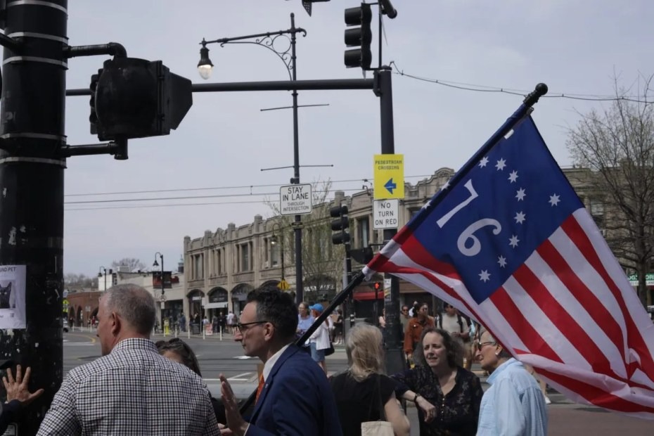 Brookline residents waved American flags and held signs condemning President Trump’s administration at Coolidge Corner Saturday on the 250th anniversary of the start of the Revolution.