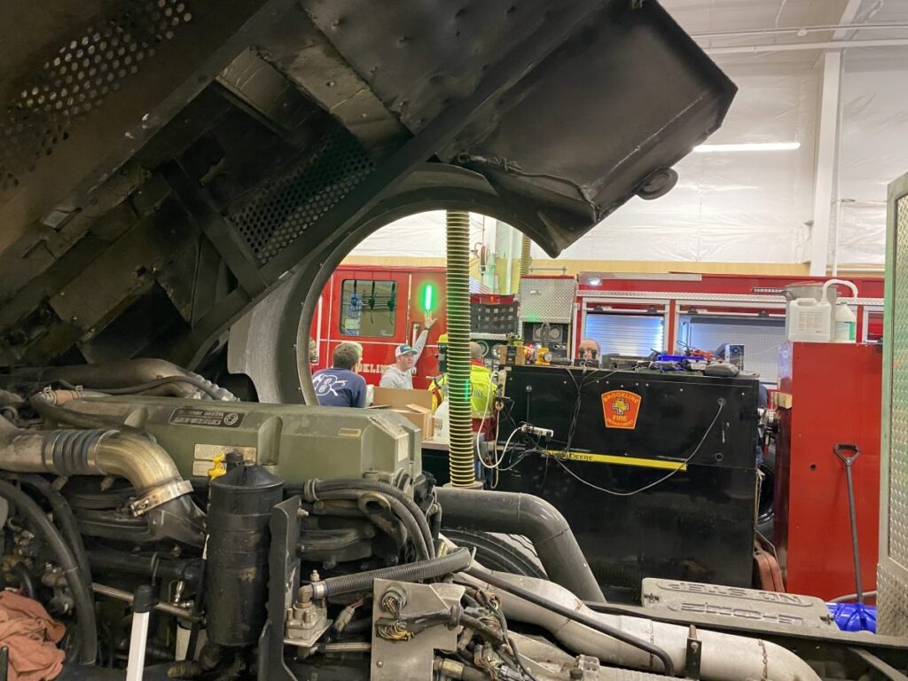 The old engine’s front cabin was tilted up last Wednesday for repairs because the power steering box had been leaking fluid. Tuttle was waiting for a new box to arrive to replace the faulty one as Wiers wrapped up his second day of training on the new engines.