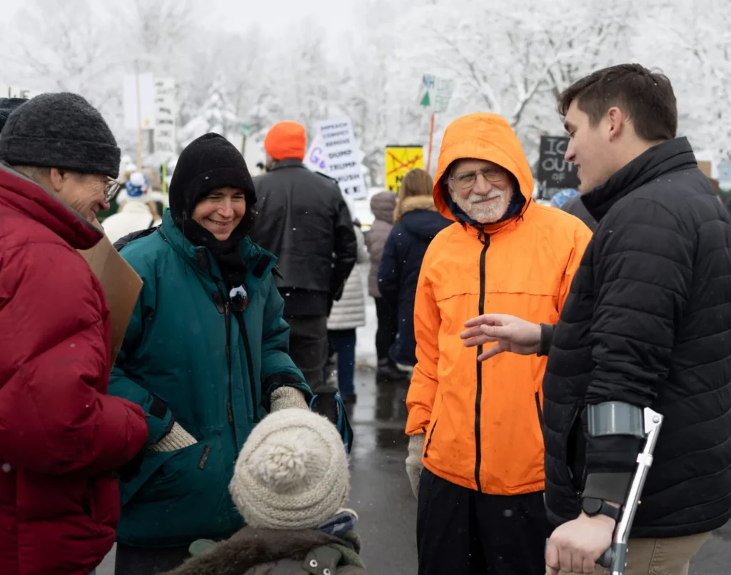 David Klafter (left), Suzette Abbott (in the white hat), and Edward Loechler (in orange), converse with New Hampshire State Rep. Heath Howard (right) at the protest. Photo by Milena Fernsler