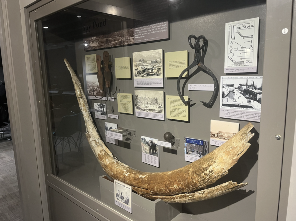 Local fisherman Arvid Carlson uncovered the tusk while fishing in Spy Pond with his then 10-year-old son, Steve. Carlson gave the tusk to the Boston Museum of Science, which donated it to the Arlington Historical Society in 1987.