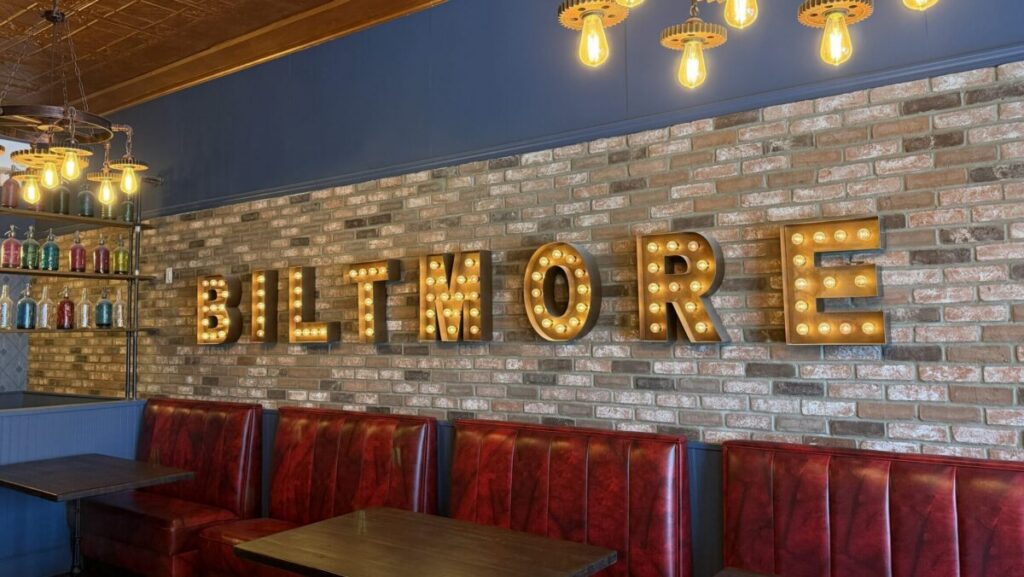 Indeed, the interior still feels rustic, now enhanced by thoughtful cosmetic updates that bring a more upscale, lively aesthetic. The wood floors have been redone, retaining their classic creak underfoot. Small details reinforce the space’s industrial character, from gear-inspired chandeliers to a large marquee-style Biltmore sign reminiscent of vintage cinema façades.